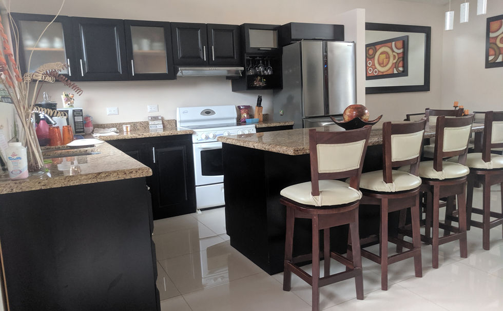 Large kitchen with fridge, micro, stove, lots of cupboard space. Centre island with seating for five.